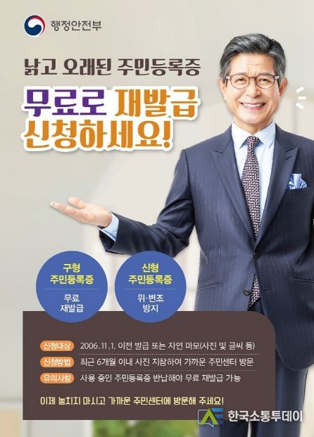 한국소통투데이 관리자 기자 | 파주시는 2006년 11월 1일 이전 발급받은 주민등록증 소지자를 대상으로 재발급 서비스를 실시하고 있다. 이번 서비스로 기존 소지자들은 보안 기능이 강화된 신형 주민등록증으로 무료 발급이 가능하게 됐다.