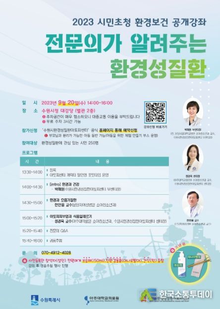 한국소통투데이 관리자 기자 | 수원시 환경성질환아토피센터는 9월 20일 수원시청 대강당에서 시민초청 환경보건 공개강좌 ‘전문의가 알려주는 환경성질환’을 연다.