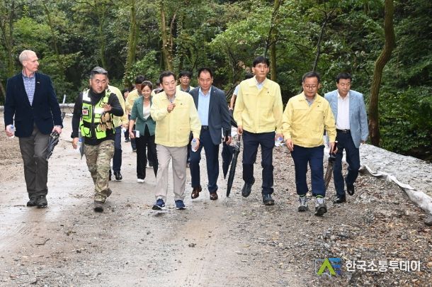 현재 1.1㎞ 길이의 도로를 복구하고 있다. 배수가 원활하게 이뤄지도록 배수로를 정비하고, 안전을 위해 가드레일과 돌망태 옹벽을 설치한다. 현재 공정률은 65%이고, 11월 중 준공 예정이다.