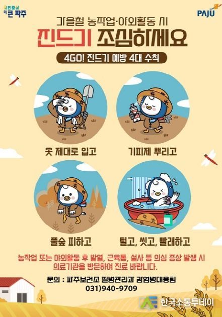 임미숙 파주보건소장은 “9월부터 11월은 야생 진드기 유충이 왕성하게 활동하는 시기로, 가을 행락철을 맞아 등산이나 벌초, 성묘, 농산물을 수확할 때 주의가 필요하다”라며 “야외활동 후 2주 이내 고열, 근육통, 소화기 증상이 나타나면 즉시 의료기관에 방문해 적기에 치료받기를 바란다”라고 전했다.