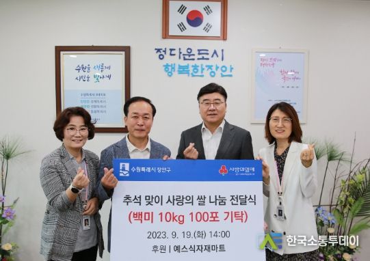 한국소통투데이 관리자 기자 | 수원시 장안구 정자2동에 위치한 예스식자재마트가 19일, 추석 명절을 맞아 장안구에 10㎏ 백미 100포를 기부했다.