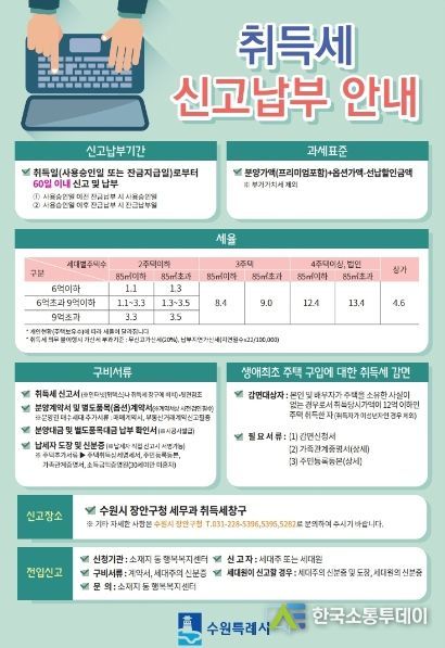 한국소통투데이 관리자 기자 | 수원시 장안구가 하반기 대규모 아파트의 입주에 따라 취득세 신고 납부 안내문 비치와 홍보를 통해 입주자들에게 취득세 신고납부에 따르는 불편을 최소화 할 계획이다.