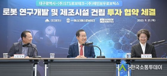 한국소통투데이 관리자 기자 | 대구광역시는 9월 21일 오후 3시 대구시청 산격청사에서 ㈜STS로보테크의 AI로봇시스템 통합연구소 및 협동, 서비스 로봇 제조공장 건립, 그리고 ㈜레인보우로보틱스의 대구테크센터 설립 및 협동, 서비스로봇 STS로보테크 위탁생산 등을 주요 내용으로 하는 투자협약을 체결했다.