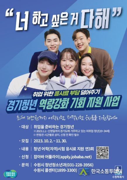 한국소통투데이 관리자 기자 | 수원시가 취업 준비 청년을 대상으로 어학‧자격시험 응시료를 지원하는 ‘경기청년 역량강화 기회 지원 사업’ 신청을 10월 2일부터 11월 30일까지 받는다.