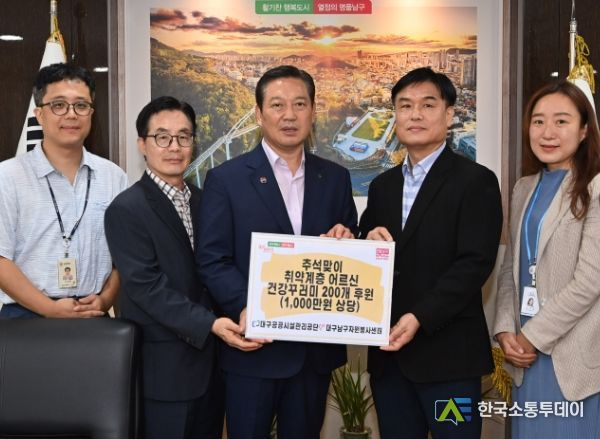 한국소통투데이 관리자 기자 | 대구광역시 남구청은 지난 20일, 대구공공시설관리공단에서 추석을 맞이하여 어르신들을 위한 건강꾸러미 200개(1,000만원 상당)를 남구자원봉사센터를 통해 후원했다고 22일 밝혔다.