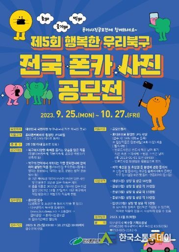 접수기간은 오는 9월 25일부터 10월 27일까지이며, 규격은 휴대폰으로 촬영한 JPG파일(접수 등록시 : 5Mb 이하, 입상작은 5Mb이상 제출)로 1인 3점 이내 출품할 수 있고, 별도 출품료는 없으며 북구청 홈페이지에 접속하여 본인인증 후 참여할 수 있다.