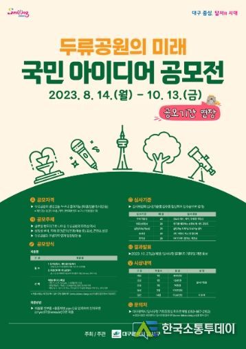 이태훈 달서구청장은 “10월 2일 임시공휴일 지정으로 공모 기간 연장에 대한 문의가 이어졌다. 더 많은 사람에게 참여기회를 제공하고자 공모 기간을 연장하게 됐다.”며 “6일 동안의 황금 연휴 기간에 가족들과 함께 행복한 시간을 보내며 대구의 보물인 두류공원의 미래를 함께 그려보는 소중한 시간을 가지길 바란다.”고 밝혔다.