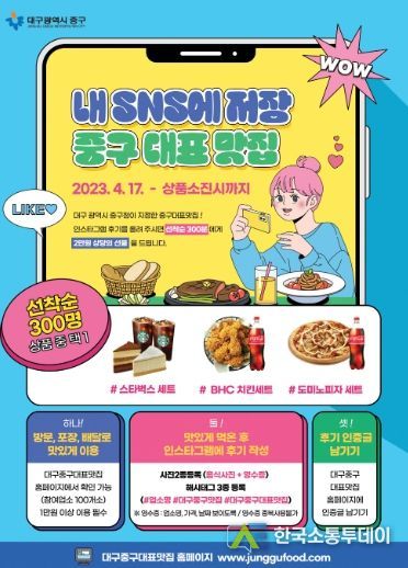 한국소통투데이 관리자 기자 | 대구 중구는 올 4월과 9월, 2회에 걸쳐 실시한 ‘중구 대표 맛집 SNS 이벤트’를 성황리에 마쳤다.