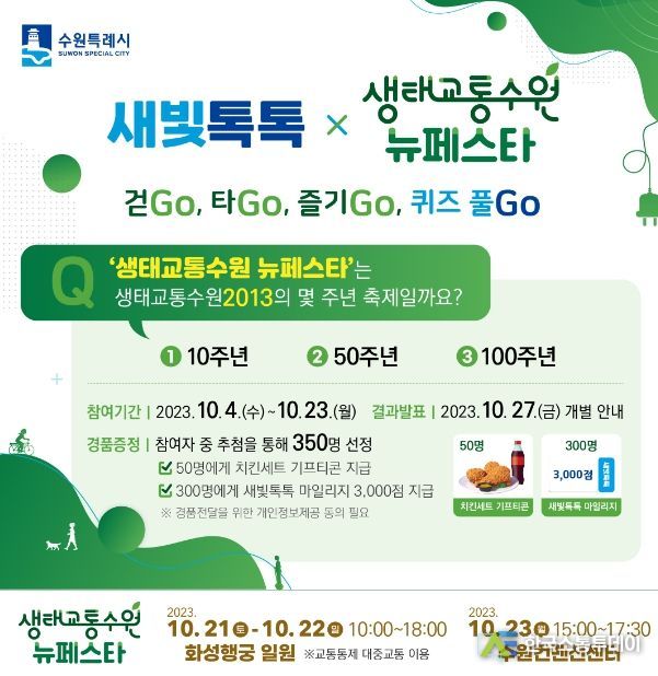 한국소통투데이 관리자 기자 | 수원시가 ‘생태교통 수원 2013’ 개최 10주년을 맞아 10월 4일부터 23일까지 ‘새빛톡톡 × 생태교통수원 뉴페스타’ 퀴즈 이벤트를 연다.