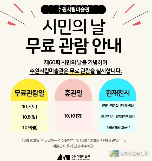 한국소통투데이 관리자 기자 | 경기도 수원시립미술관은 제60회 '수원시민의 날'을 기념해 10월 7일부터 10월 9일까지 3일간 수원시립미술관 무료 관람을 실시한다.