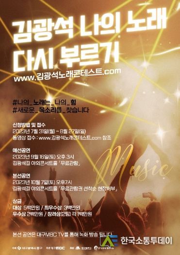 한국소통투데이 관리자 기자 | 대구 중구는 10월 7일 오후 7시 김광석길 콘서트홀에서 ‘2023년 김광석 나의 노래 다시 부르기’ 대회를 개최한다.