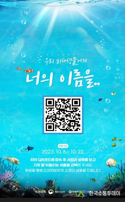 한국소통투데이 관리자 기자 | 해양수산부는 한글날(제577돌)을 맞이하여 10월 6일부터 22일까지 ‘우리말 바다생물 이름짓기 대국민 선호도 조사’를 실시한다.