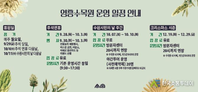 11일에는 두 수목원 모두 휴원한다. 일월수목원은 제60회 수원화성문화제 국제 우호 도시의 날 행사로 인해 7일 휴원할 예정이다.