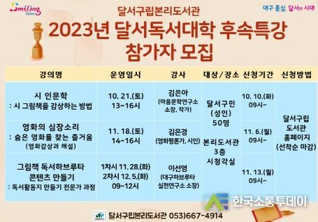 2023년 달서독서대학 후속특강은 시 인문학(10. 21. 토 13시), 영화의 심장소리(11. 18. 토 14시), 그림책 독서하브루타 콘텐츠 만들기(11. 28., 12. 5. 화 09시) 주제로 총 3회 운영된다.