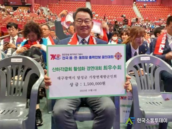 한국소통투데이 관리자 기자 | 달성군재향군인회 현경호 회장은 지난 4일 서울 올림픽공원 올림픽 홀에서 개최된 향군창설 71주년 기념식에서 대통령 표창을 수상하는 영예를 안았다. 또한 남명숙 재향군인회 여성회장은 여성회 우수사례 발표 경연대회에서, 김동병 재향군인회 가창면회장은 읍ㆍ면ㆍ동 우수사례발표 경연대회에서 각각 최우수상(상금 150만원)을 수상하는 쾌거를 이루었다.