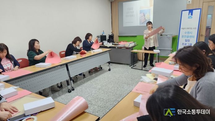 한국소통투데이 관리자 기자 | 수원시는 지난 11일 수원시 휴먼콜센터 내 교육장에서 감정노동자1) 인 휴먼콜센터 상담직원들을 위한 힐링 프로그램 ‘선물포장 실습수업’을 진행했다.