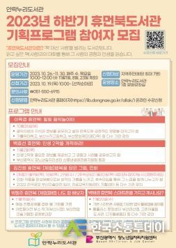 한국소통투데이 관리자 기자 | 부산 동래구는 이달 26일부터 11월 30일까지 매주 수요일, 목요일 오전 안락누리도서관에서 지역주민을 대상으로‘2023년 하반기 휴먼북도서관 기획프로그램’을 운영한다고 밝혔다.
