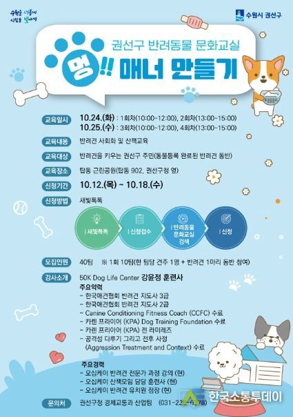 한국소통투데이 관리자 기자 | 수원시 권선구가 오는 10월 24일, 25일 양일에 걸쳐 ‘2023년 권선구 반려동물 문화교실 '멍! 매너 만들기'’를 개최한다.