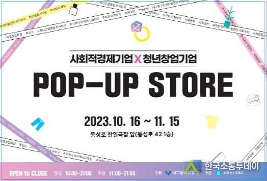 한국소통투데이 관리자 기자 | 대구 중구는 16일 오후 4시 개막식을 시작으로 11월 15일까지 한 달간 동성로42(CGV 대구한일 앞, 팝업스토어 매장)에서 ‘사회적경제기업과 청년창업 기업이 함께하는 팝업스토어’를 운영한다.