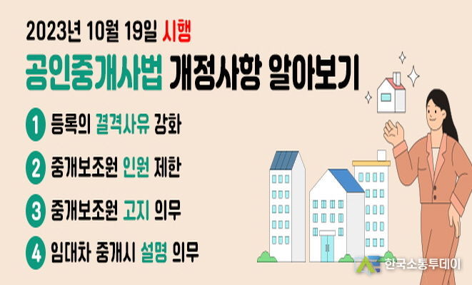 한국소통투데이 관리자 기자 | 전세사기 피해로부터 임차인을 보호하고 현행 제도의 운영상 나타난 일부 미비점을 개선·보완하기 위해 신설 및 일부 개정된 ‘공인중개사법’이 오는 19일 시행된다.