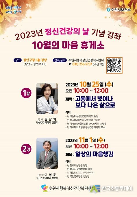 한국소통투데이 관리자 기자 | 수원시보건소와 수원시행복정신건강복지센터는 정신건강의 날(10월 10일)을 기념해 오는 10월 25일, 11월 1일 정신건강 강좌 ‘10월의 마음 휴게소’를 장안구청 6층 강당에서 진행한다.
