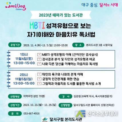 한국소통투데이 관리자 기자 | 대구 달서구는 11월 4일~5일 양일간 구민 70명을 대상으로'테마가 있는 도서관'독서치료전문가 특강(MBTI 성격유형별 자기이해와 마음치유 독서법)을 운영한다.
