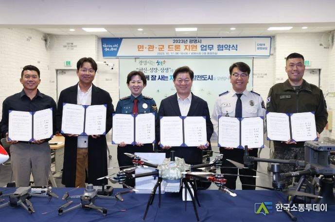 시는 17일 오전 시청 중회의실에서 광명소방서, 광명경찰서, 2506부대 2대대, 민간교육기관인 광명시드론교육원, 새빛드론과 ‘민‧관‧군 드론 지원 업무협약’을 체결했다.