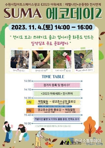 한국소통투데이 관리자 기자 | 경기도 수원시 수원시립미술관은《2023 아워세트 : 레벨나인×손동현》전시 연계 문화행사 'SUMA 에코데이2'를 11월 4일 수원시립아트스페이스광교에서 개최한다.