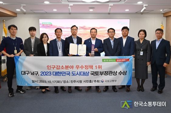 한국소통투데이 관리자 기자 | 대구광역시 남구는 지난 17일, 국토교통부가 주최한 2023년 대한민국 도시대상에서 인구감소분야 우수정책 1위로 대구·경북에서는 유일하게 국토교통부장관상을 수상했다고 18일밝혔다.
