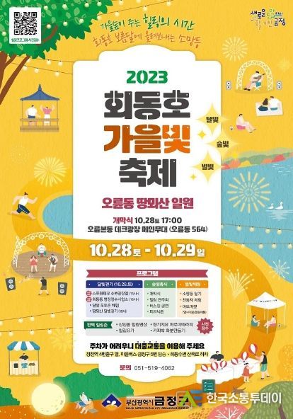 한국소통투데이 관리자 기자 | 부산시 금정구는 오는 10월 28일부터 29일까지 오륜동 땅뫼산 일원에서 ‘2023 회동호 가을빛(달빛,숲빛,별빛) 축제’를 개최한다.