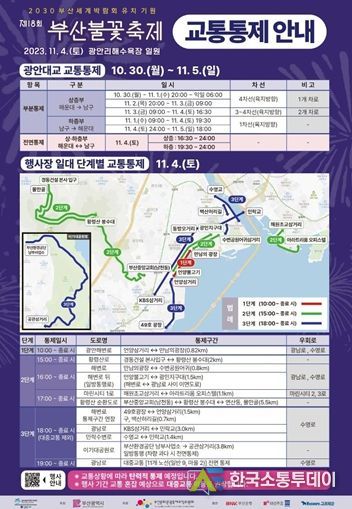 행사 당일인 11월 4일에는 광안대교 상층부(남구 방향)를 오후 4시 30분부터, 하층부(해운대 방향)를 오후 7시 30분부터 통제하고, 광안리 행사장 주변도 구간별 통제할 예정이다.