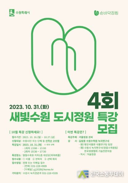 한국소통투데이 관리자 기자 | 수원시가 10월 27일까지 ‘2023년 도시정원 특강’ 4회차 참여자를 모집한다.