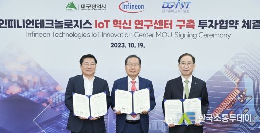 한국소통투데이 관리자 기자 | 대구광역시, 대구경북과학기술원, 인피니언테크놀로지스코리아(유)는 10월 19일 오전 11시 20분 대구 엑스코에서 인피니언테크놀로지스코리아(유) IoT 혁신센터(IoT Innovation Center) 설립 협약을 체결했다.