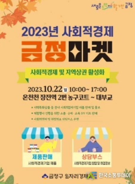 한국소통투데이 관리자 기자 | 부산시 금정구는 사회적경제 기업의 안정적 판로 지원을 위해 오는 22일(일) 10시부터 온천천 장전역 2번 농구코트 ~ 대부교에서 ‘사회적경제 금정마켓’을 개최한다.