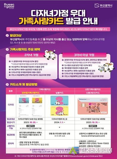 한국소통투데이 관리자 기자 | 부산시는 출산·양육이 행복한 선택이 될 수 있는 사회환경 조성을 위해 오는 10월 31일부터 다자녀가정 기준을 2자녀까지로 확대하고 리뉴얼 가족사랑카드 발급을 시작한다고 밝혔다.