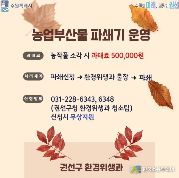 권선구는 11월부터 사전 신청한 농작물 경작지역에 농업부산물 파쇄기를 순서대로 무상 지원하며, 사전 신청은 구 환경위생과에서 전화 및 방문을 통해 접수할 수 있다고 밝혔다.