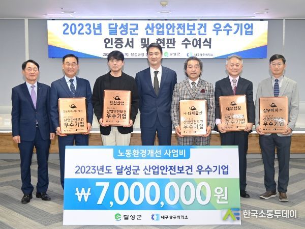 한국소통투데이 관리자 기자 | 달성군은 지난 19일, 최재훈 달성군수, 이재경 대구상공회의소 상근부회장, 산업안전보건 우수기업 5개사 대표가 참석한 가운데‘2023년 달성군 산업안전보건 우수기업 인증서 및 현판 수여식’을 개최했다.