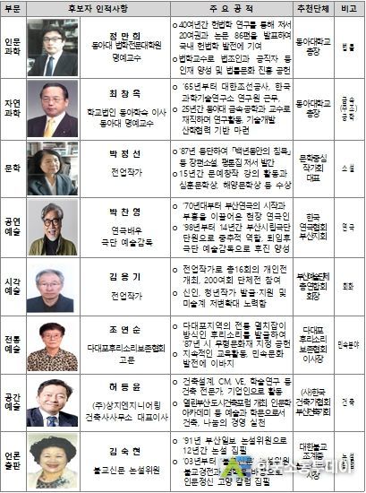 한편, 1956년 제정된 부산광역시 문화상은 현재까지 66회에 걸쳐 총 416명의 수상자를 배출한 부산시 최고 권위의 상으로, 역대 수상자들은 시민들의 삶을 풍요롭게 하고 부산 문화의 토양을 다지는 데 헌신했다.