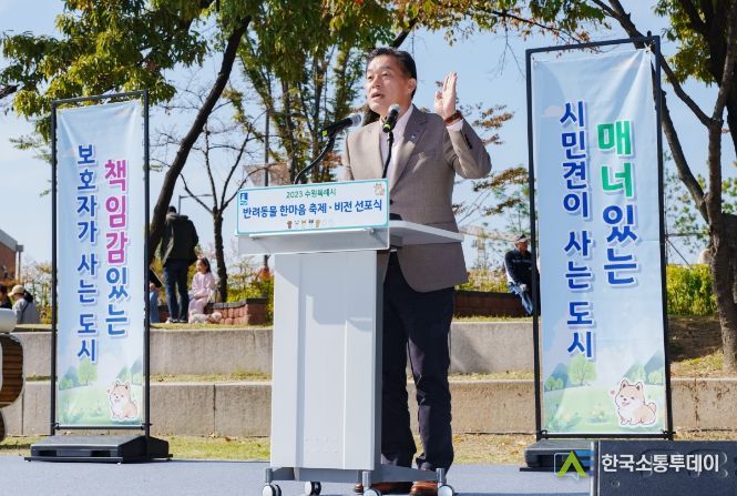 22일 서호잔디광장에서 열린 반려동물 축제 ‘함께할개(Dog) 묘(猫)한축제’에서 진행된 ‘반려동물 교육도시 비전 선포식’에서 이재준 수원시장은 “오늘 전국 최초로 ‘반려동물 교육도시’를 위한 비전을 나누고, ‘반려동물이 시민의 기쁨이 되는 도시’를 약속드리기 위해 이 자리에 섰다”고 말했다.