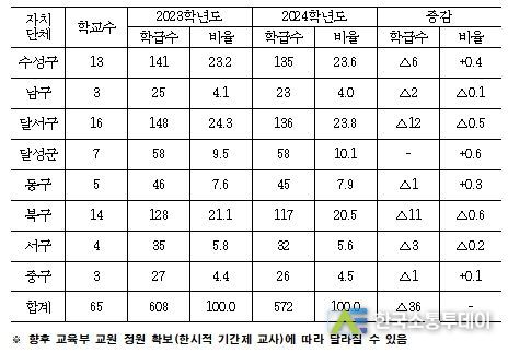 고등학교 학급 감축 기준은 학생의 지원율을 반영한 학급당 학생수, 해당지역 학생배치여건 등을 고려해 특정지역 편중 없이 대구 전체를 대상으로 신입생 학급 감축을 실시한다고 설명했다.