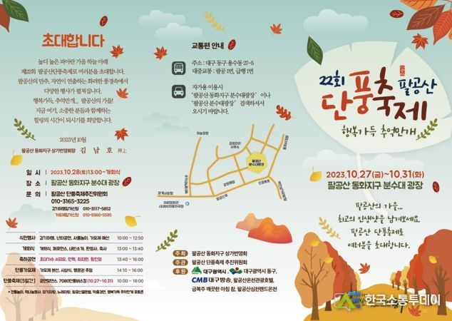 한국소통투데이 관리자 기자 | 제22회 팔공산 단풍축제가 오는 27일부터 31일까지 5일간 팔공산 동화지구 분수대 광장에서 열린다.