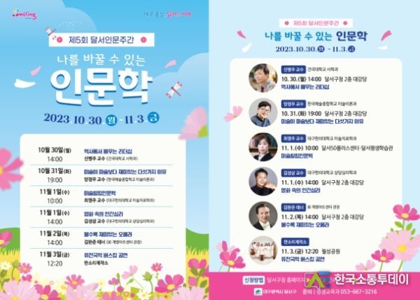 한국소통투데이 관리자 기자 | 대구 달서구는 10월 30일부터 11월 3일까지“나를 바꿀 수 있는 인문학”이라는 슬로건으로 제5회 달서인문주간을 운영한다고 밝혔다.