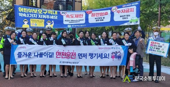 한국소통투데이 관리자 기자 | 대구 달서구는 25일 아침 진천동 대형원시인석상 앞 상화로와 대진초등학교 주변도로에서 교통사고 예방을 위한 가을 행락철 교통안전 캠페인을 실시했다.