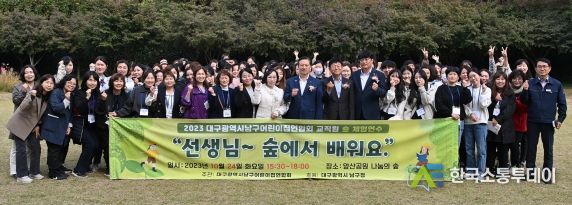 한국소통투데이 관리자 기자 | 대구광역시 남구청은 지난 24일, 앞산공원 나눔의 숲에서 관내 어린이집 보육 교직원 100여명을 대상으로 숲체험 연수를 실시했다고 26일 밝혔다.