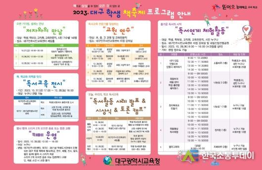 한국소통투데이 관리자 기자 | 대구시교육청은 즐거운 독서문화를 확산하고, 학교와 지역사회 독서인문교육 소통의 장을 마련하기 위해 10월 27일부터 28일까지 양일간 대구민주시민교육센터, 대구2ㆍ28기념학생도서관에서 ‘2023. 대구 학생 책축제’를 개최한다.