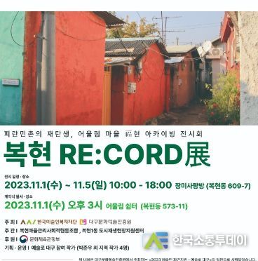 한국소통투데이 관리자 기자 | '복현마을관리사회적협동조합'은 11월 1일부터 5일까지 주민 공유공간인 장미사랑방에서 마을 아카이빙 전시회 ‘복현 RE:CORD展’을 개최한다.