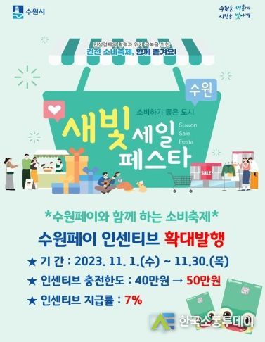 한국소통투데이 관리자 기자 | 수원시가 ‘제2회 새빛세일페스타, 수원’ 개최를 기념해 11월 한 달 동안 ‘수원페이 인센티브’ 충전 한도를 기존 40만 원에서 50만 원으로 확대한다.