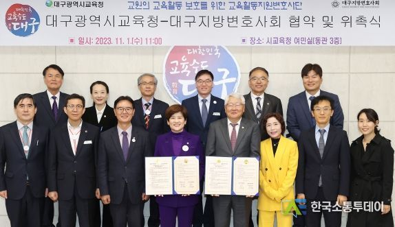 한국소통투데이 관리자 기자 | 대구시교육청은 교원이 교육활동에 전념할 수 있는 환경을 조성하기 위해 11월 1일 11:00 대구지방변호사회와 업무협약을 맺고 교육활동 침해 사안 발생 초기부터 적극적인 법률 지원에 나선다고 밝혔다.