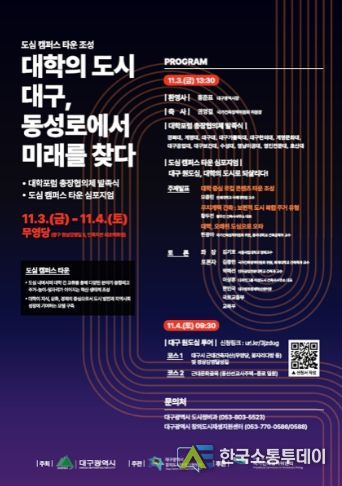 ‘대학의 도시 대구, 동성로에서 미래를 찾다’라는 주제로 열리는 이번 행사는 11월 3일 도심 캠퍼스 타운 조성 추진을 선언하는 ‘대학 포럼 총장협의체 발족식’을 시작으로 관련 분야 전문가들이 참여하는 ‘도심 캠퍼스 타운 심포지엄’이 이어질 예정이다. 11월 4일에는 일반 시민들을 대상으로 도심 내 역사문화자원을 탐방하는 ‘대구 원도심 투어’도 진행된다.
