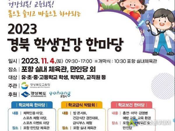 한국소통투데이 관리자 기자 | 경북교육청은 4일 포항실내체육관 및 포항시 소재 만인당 일원에서 학생, 학부모, 교직원, 지역주민 등 6,000여 명의 현장 참가자와 2만여 명의 온라인 관람객을 대상으로‘2023 경북 학생건강 한마당’행사를 개최한다.